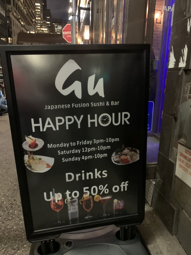“ We love Gu! Have been many times and it's always a great experience. The sushi is fresh, the service is fast, and the drinks are cheap!! Happy hour until 10pm every night with $7 cocktails -- can't beat that. It's typically quieter on week nights and busier on weekends, at least in our experience. Would recommend! ”